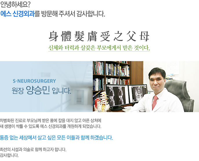 안녕하세요?에스 신경외과를 방문해 주셔서 감사합니다. 身 體 髮 膚 受 之 父 母(신체와 터럭과 살갗은 부모에게서 받은 것이다)